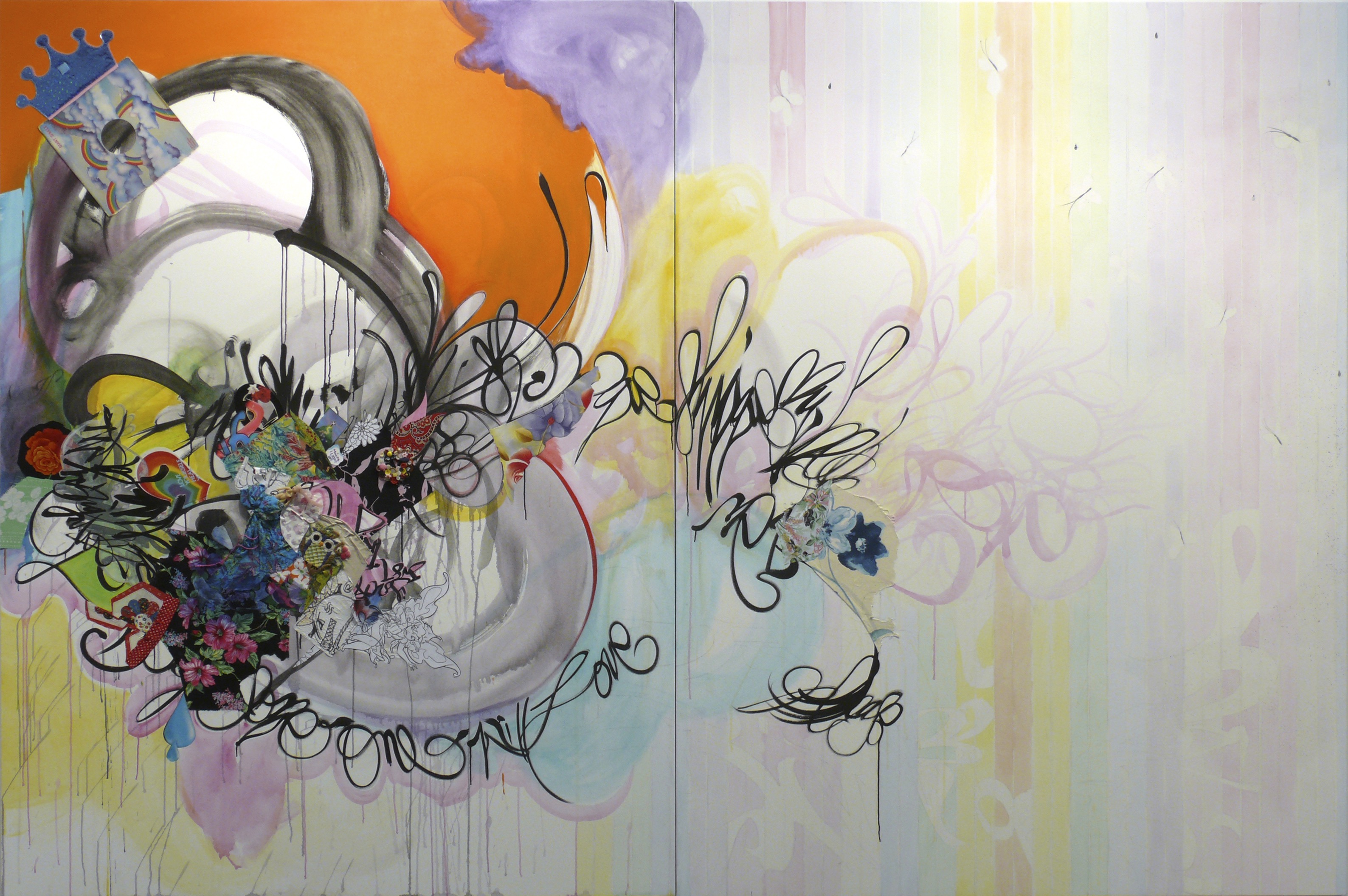 SHINIQUE SMITH AND IT FEELS LIKE LOVE, 2009 TÉCNICA MIXTA (ACRÍLICO, ACUARELA, GOUACHE), TEJIDO, COLLAGE, PURPURINA Y OBJETOS SOBRE TELA 244 X 366,5 CM